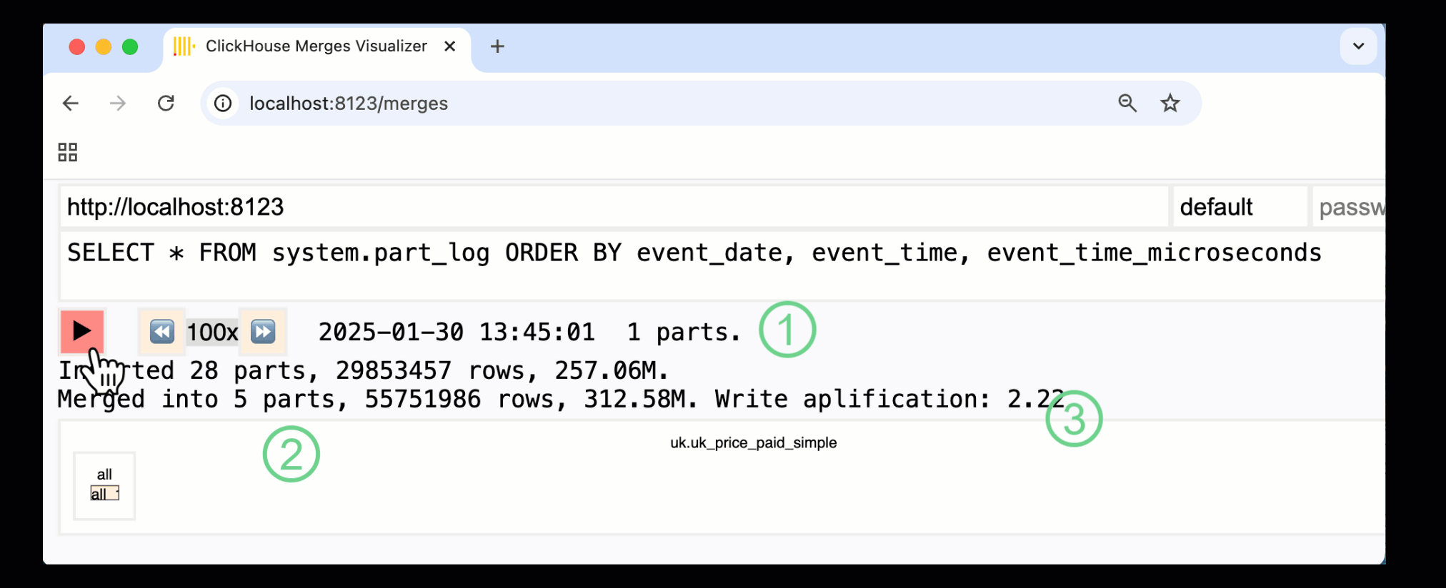 The recorded dashboard above captures the entire process, from the initial data inserts to the final merge into a single part: